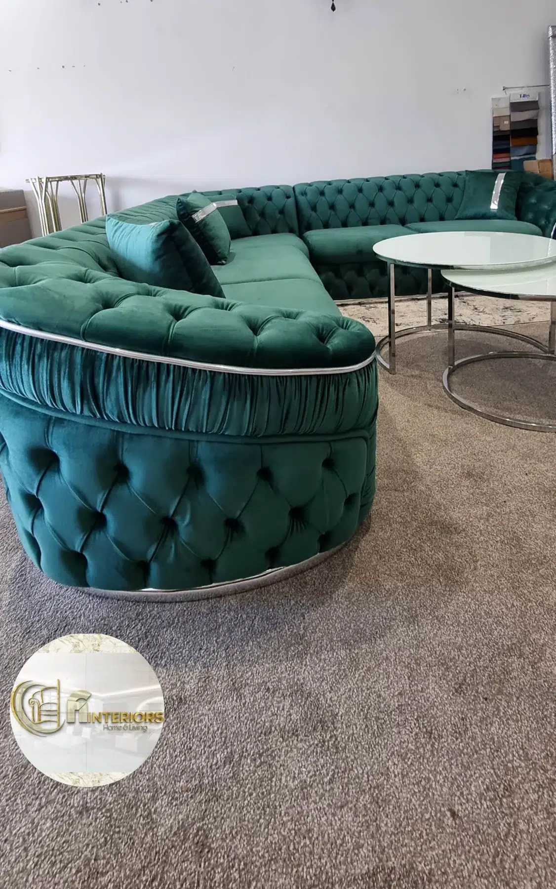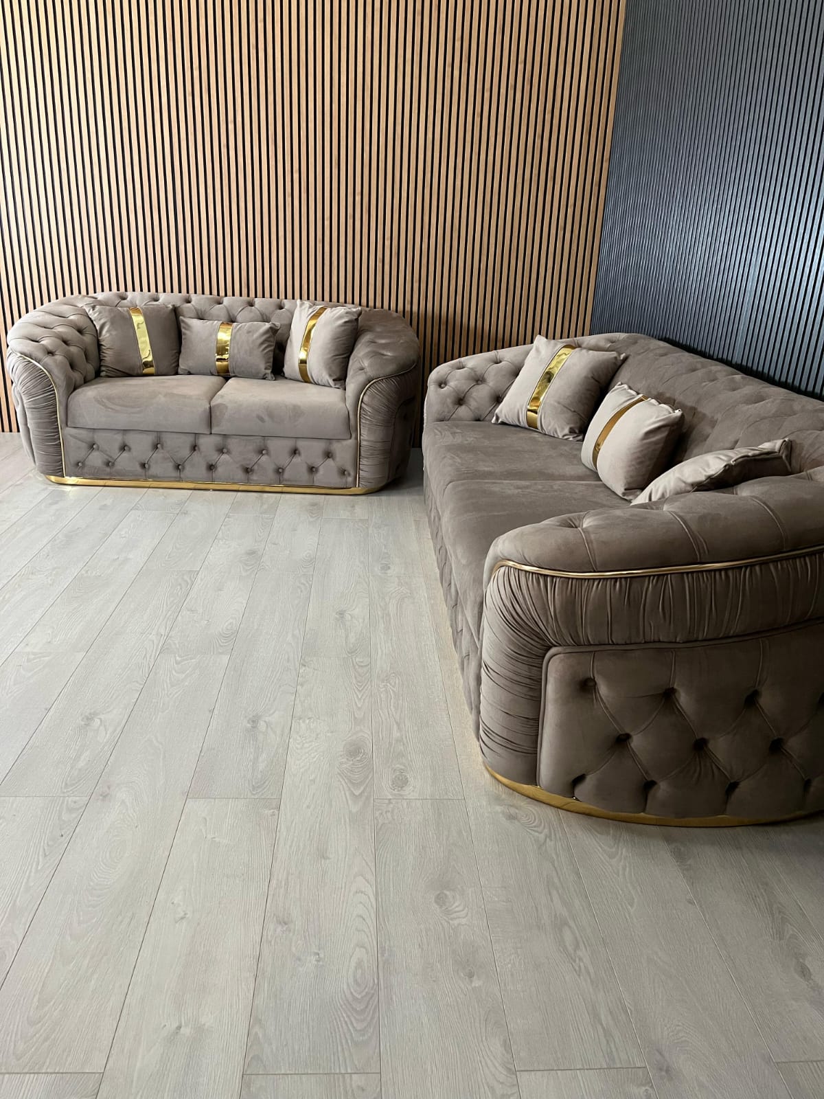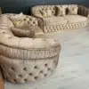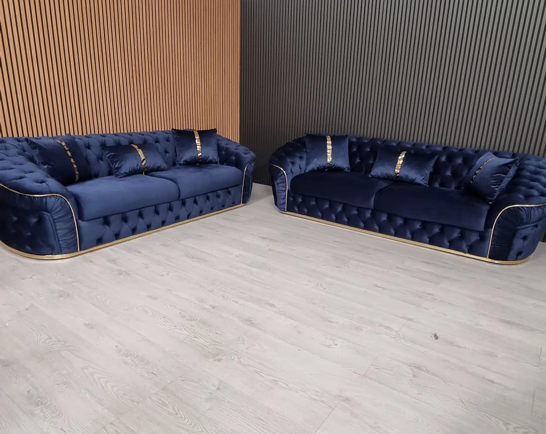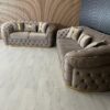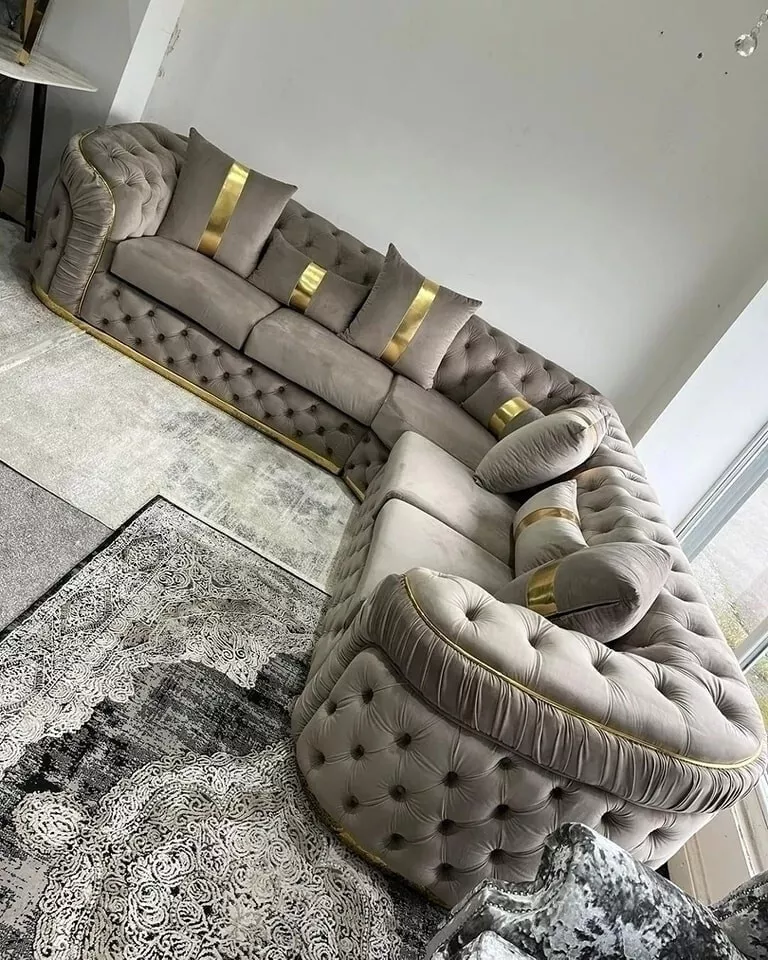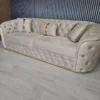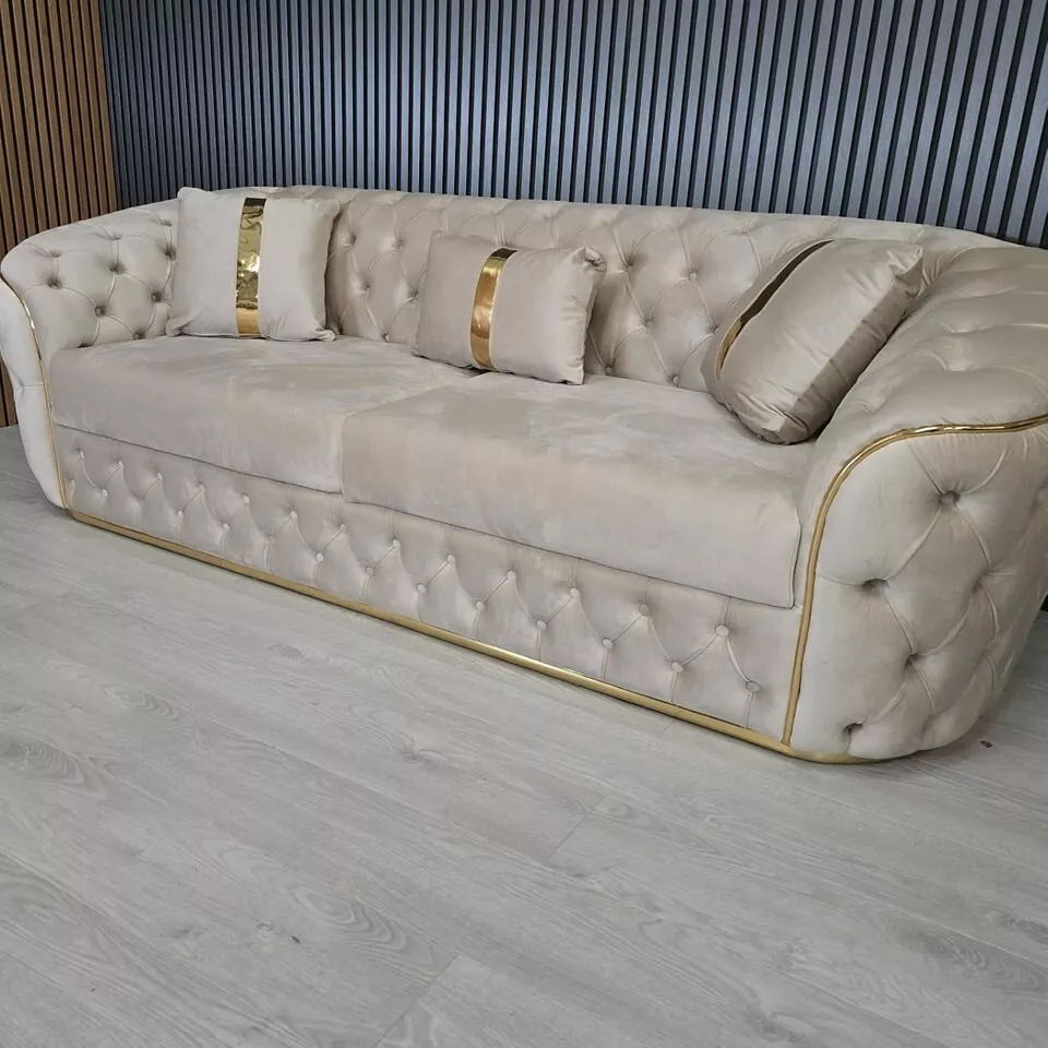 Our latest design incorporates Classic deep tufted Chesterfield sign with generous wide arm rests and enhanced with either a gold or silver trim on the base.