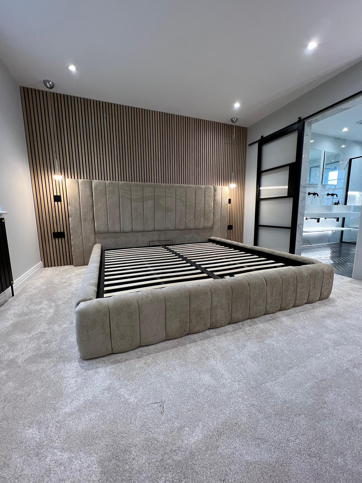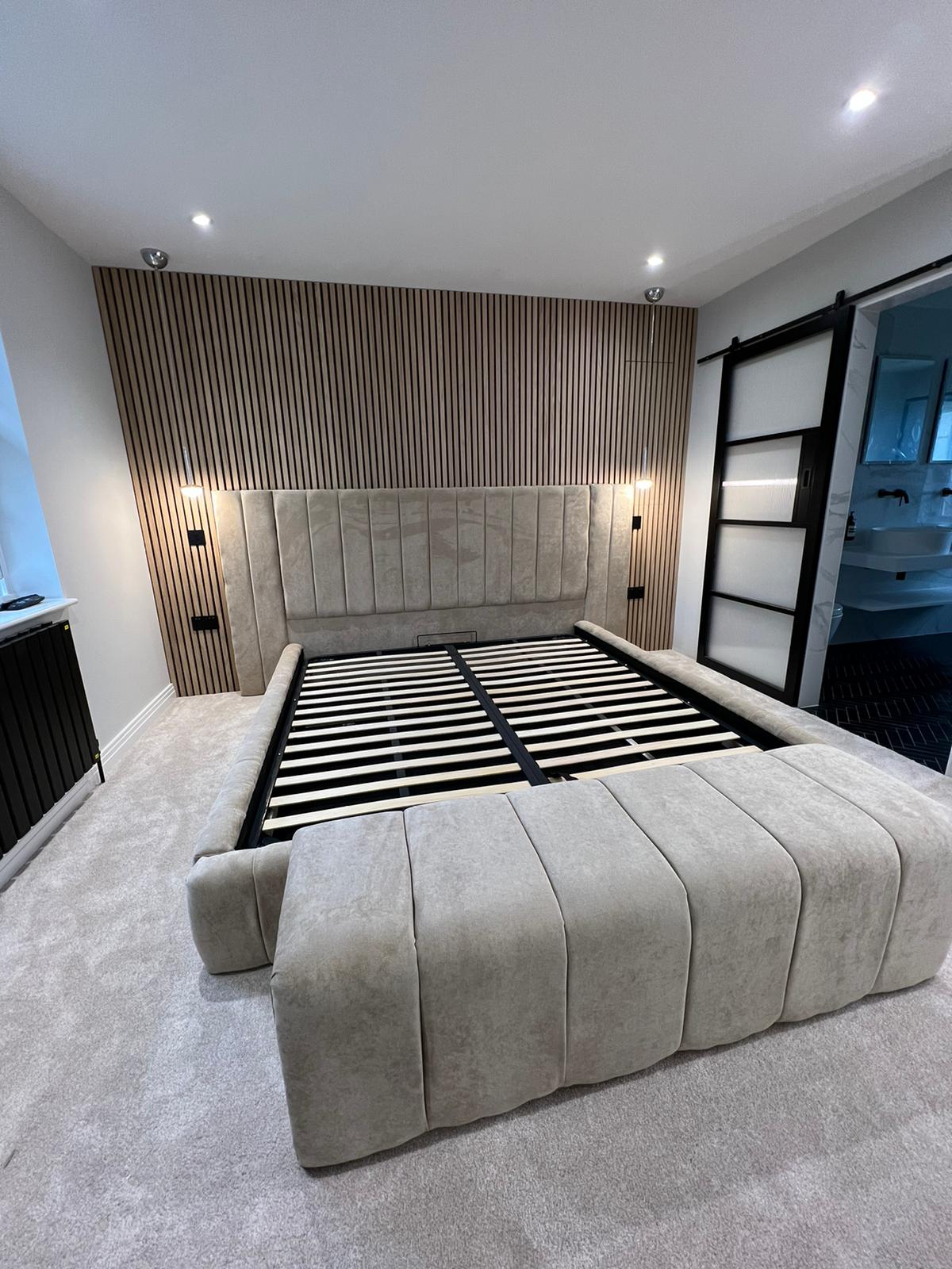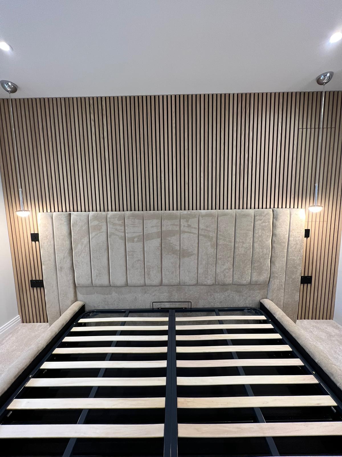 Modern panelled art deco design headboard which is extended at either side to give it a 5 star luxury hotel look.