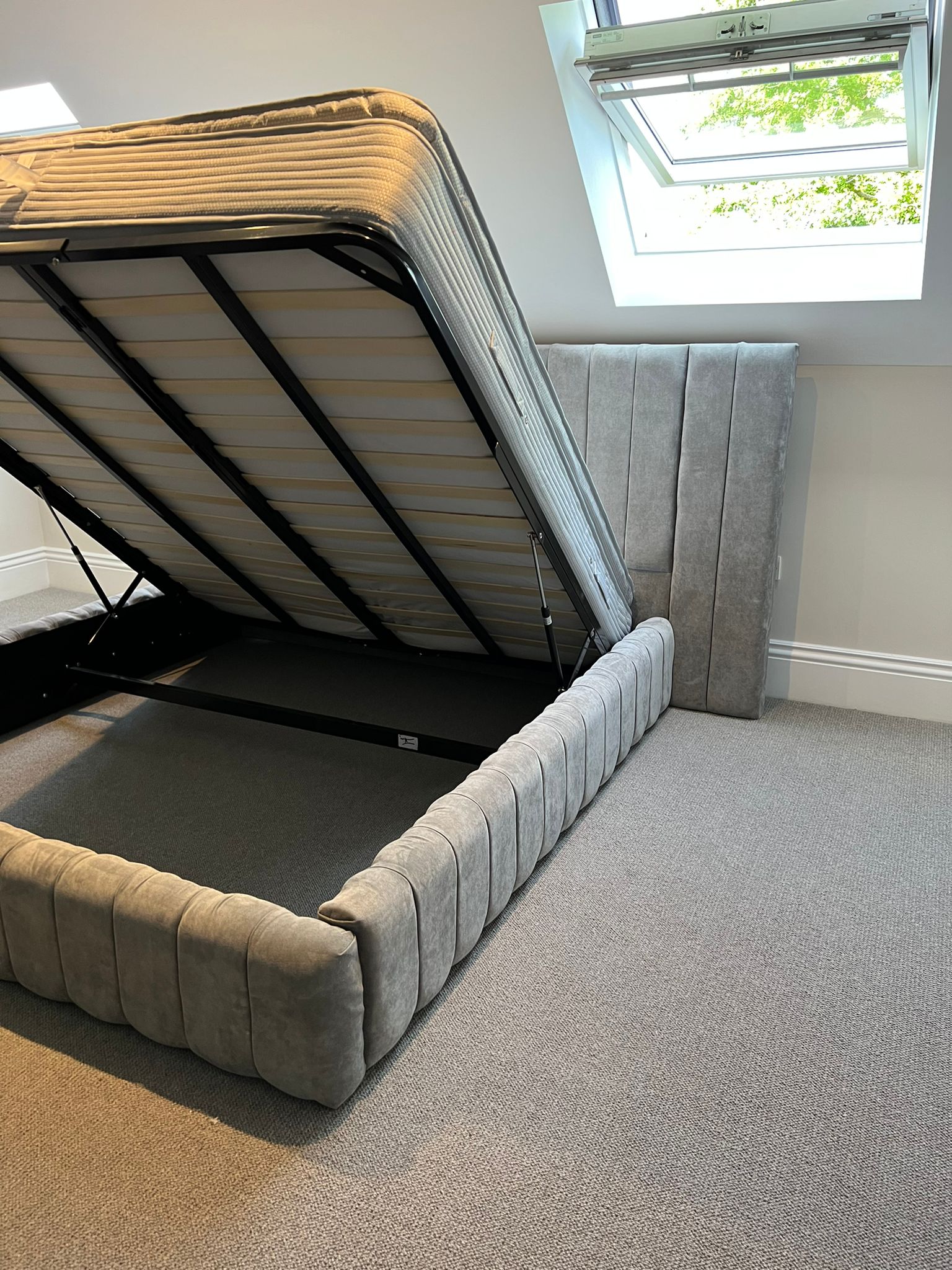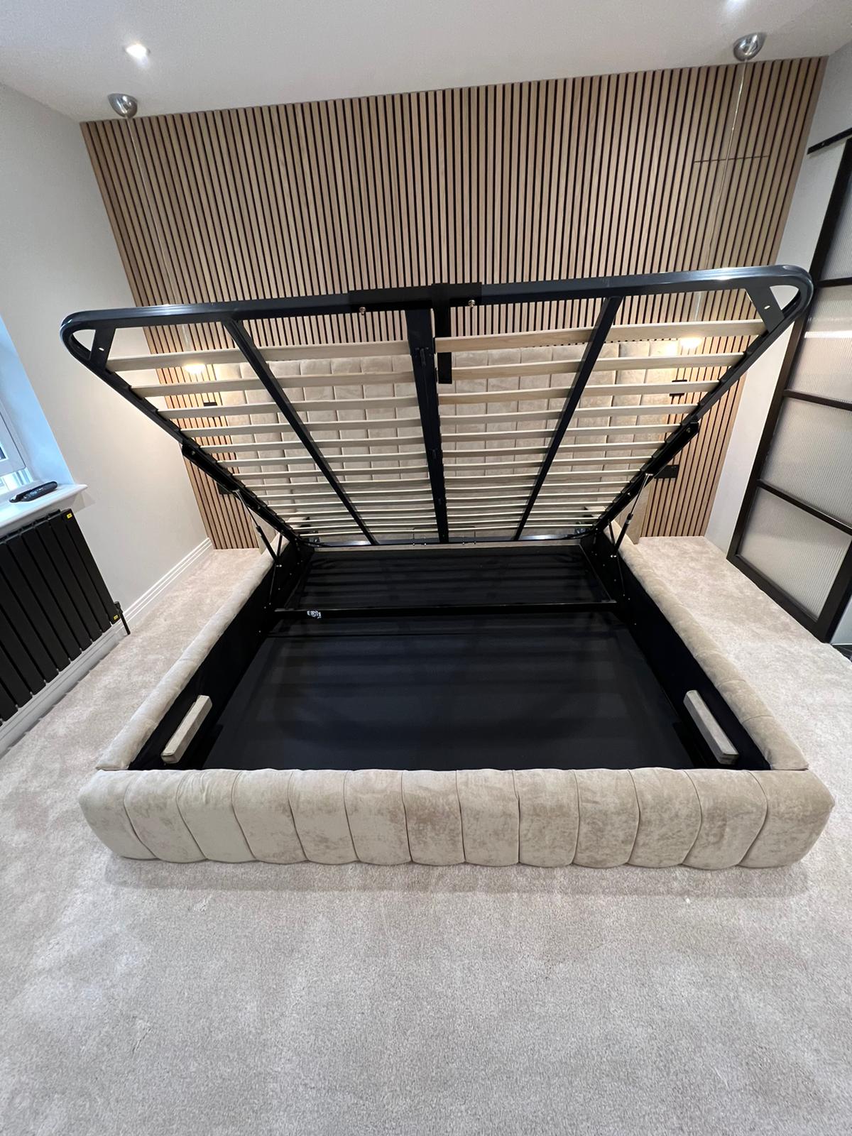The exterior of the bed will look exactly the same as the non storage bed so there is no compromise on style, to access storage simply give the fabric handle at the end of the bed a little tug this will operate the lift system which then raises the bed frame and mattress .