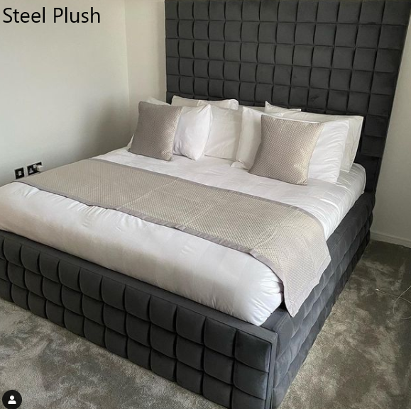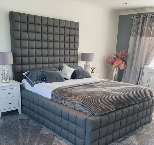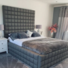 This imposing bed frame consists of a tall head board with a cubed design on the foot board head and sides.