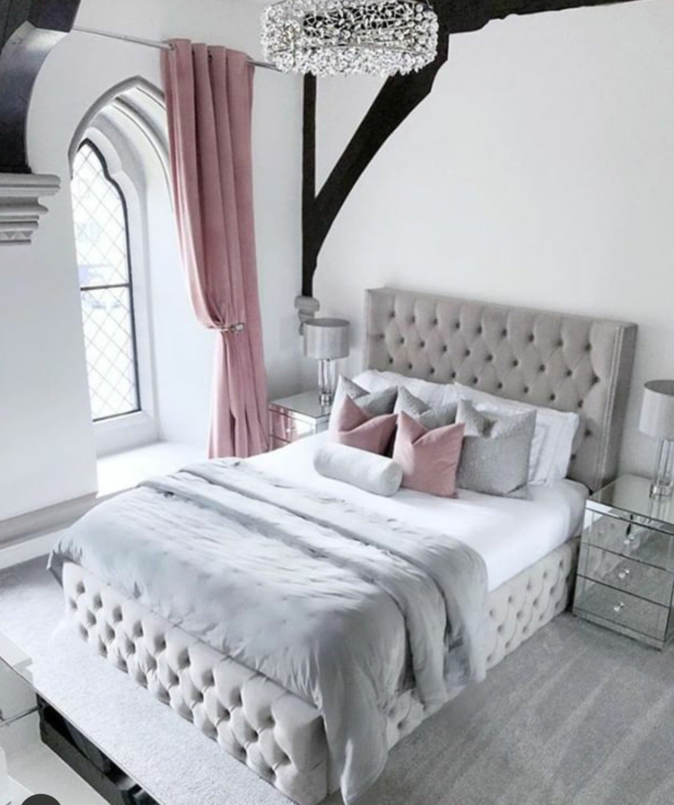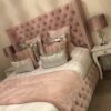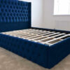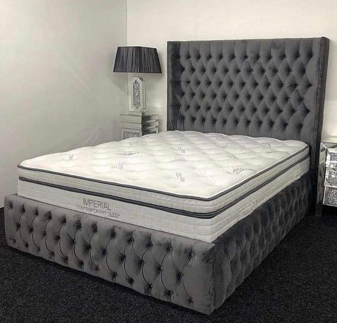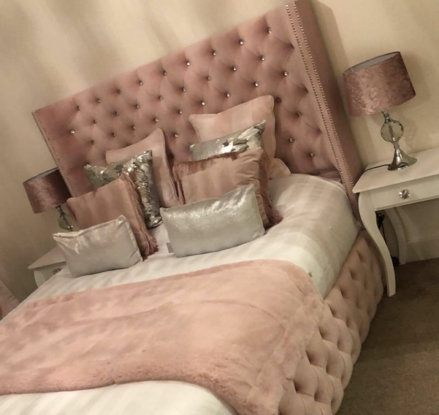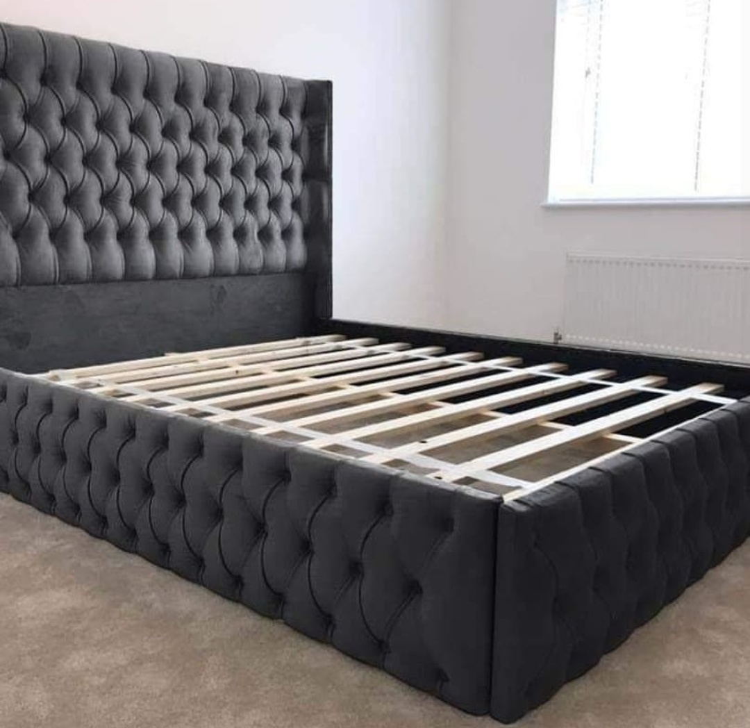 The Chesterfield upholstery extends to the side rails and foot board. The standard bed comes with matching fabric buttons however we can also make this with diamante crystal buttons at the same price just send us a message when ordering.
