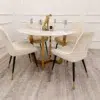 Discover the Lucien Gold 1.2 Round Dining Table. This product features extensive customization options for sizes, materials, colors, and styles, ensuring each piece is uniquely tailored to your taste. Being proudly made in Yorkshire, supporting local craftsmanship, it guarantees strict quality control and supports the local economy. The product is crafted using high-quality, sustainably sourced materials, offering durability and comfort. With innovative designs with tech-savvy features and ergonomic designs, it stays ahead of trends and provides unmatched convenience. Enjoy cost-effective pricing directly from the manufacturer, which makes it an excellent value for the cost. Our products come with strong warranties and additional services like home viewing, measurement, and assembly, enhancing your purchase experience. Additionally, we offer bespoke service with personalized customer service, ensuring that each client’s needs are thoroughly met. Lastly, we are committed to sustainable manufacturing practices, promoting eco-friendly choices. This stunning design is a 1.2 Round Table. Featuring the Pandora Gold Sintered Stone Top.
