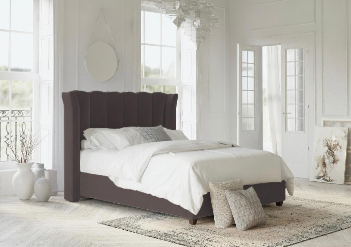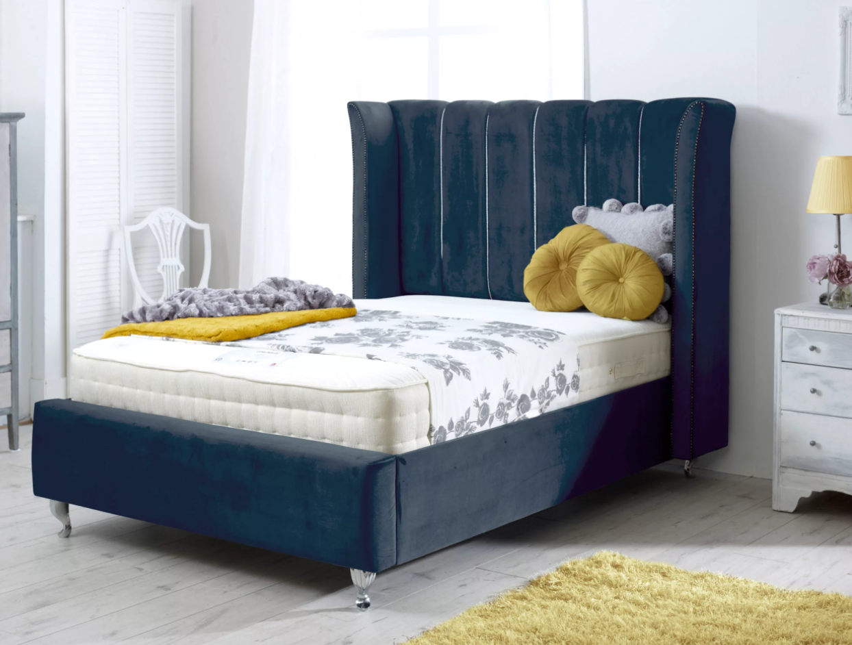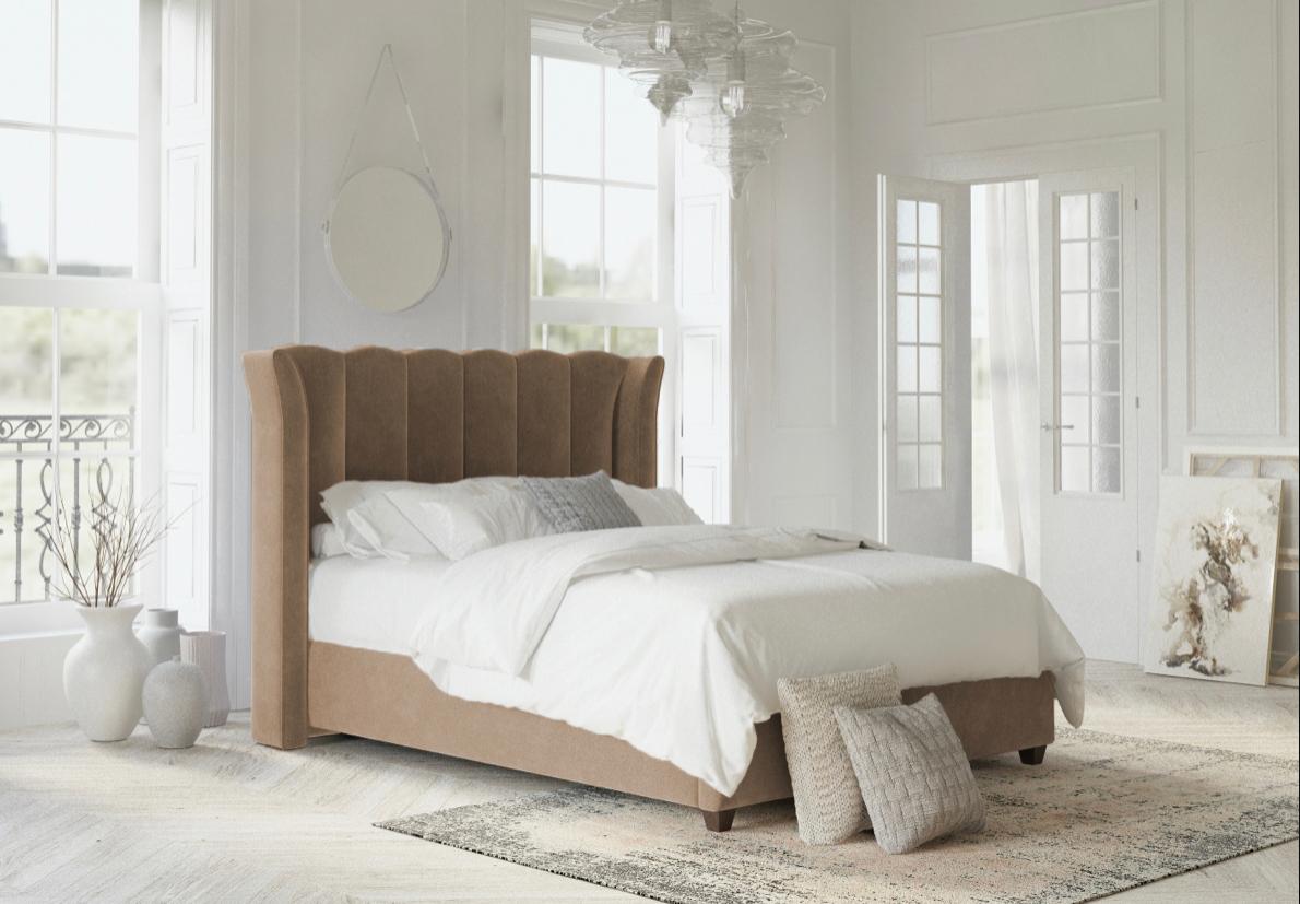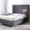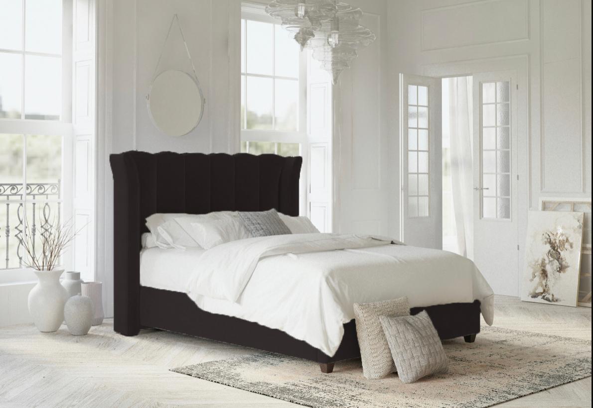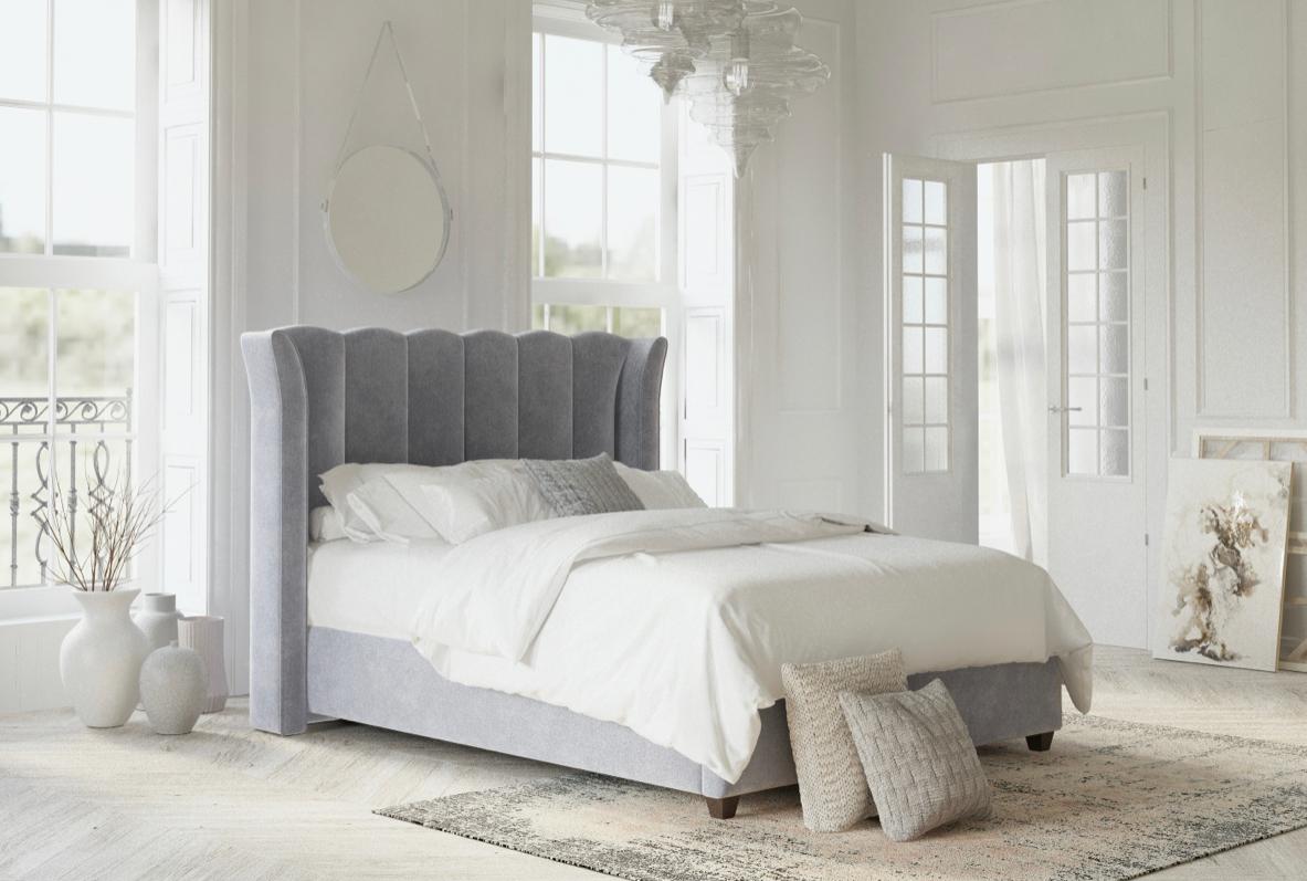 This bed features an imposing curved wing headboard with contrast piping and metal beading. The Chunky upholstered panels make this a very comfortable bed with a luxury feel.
