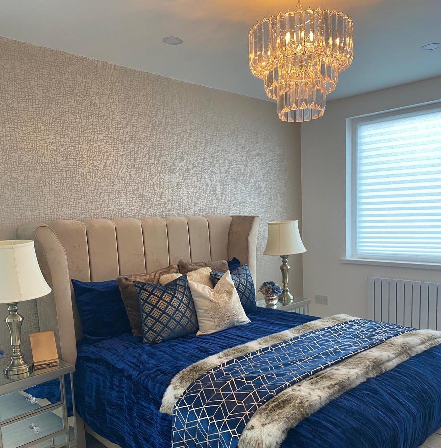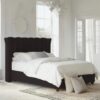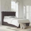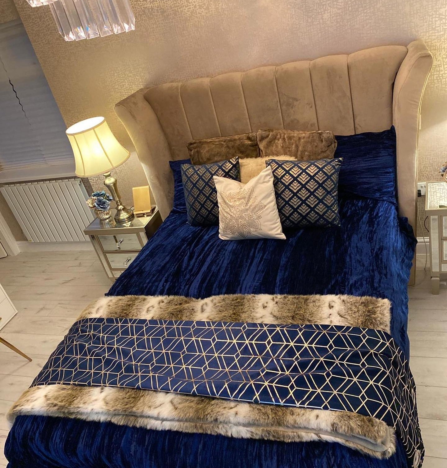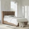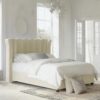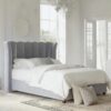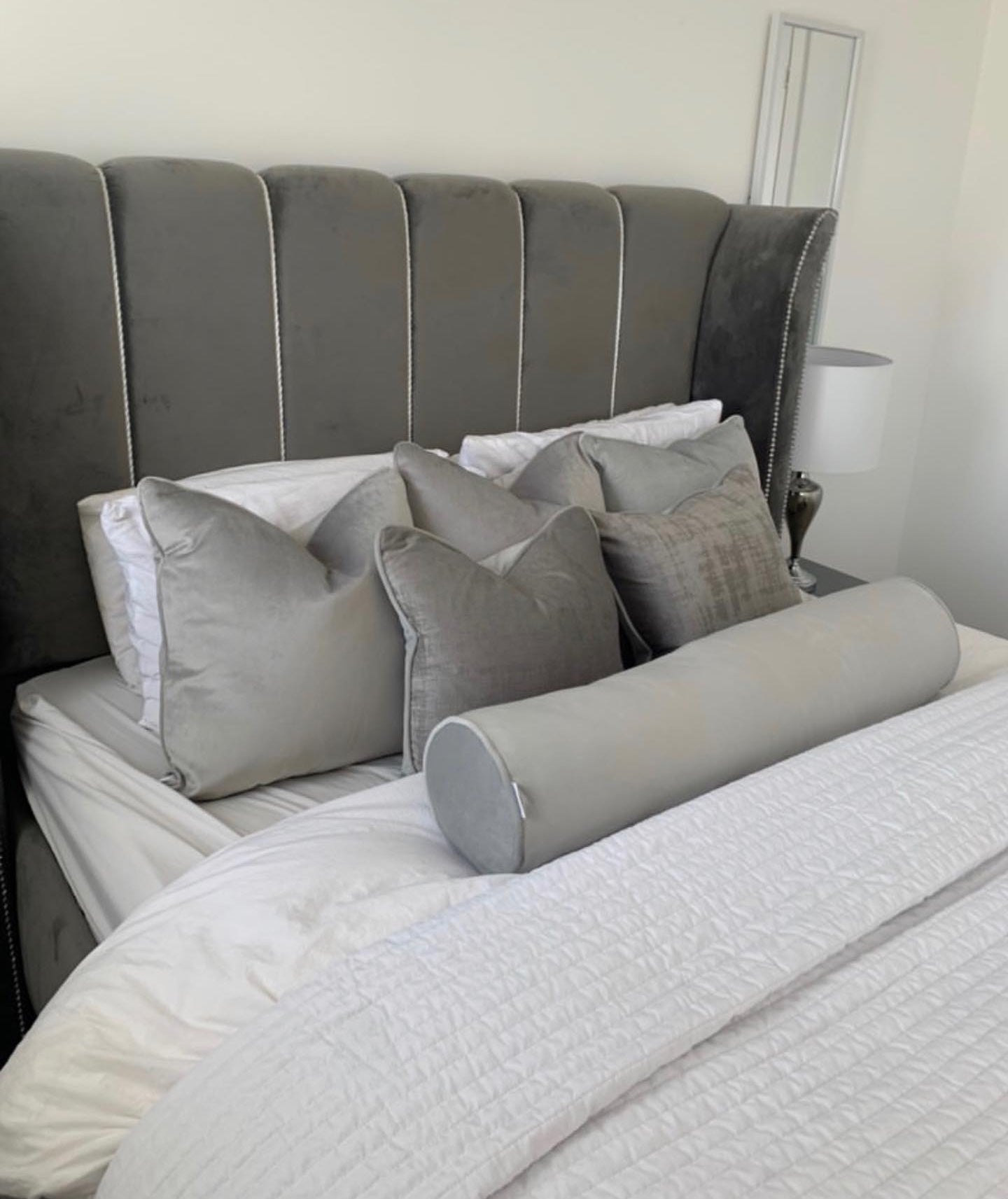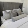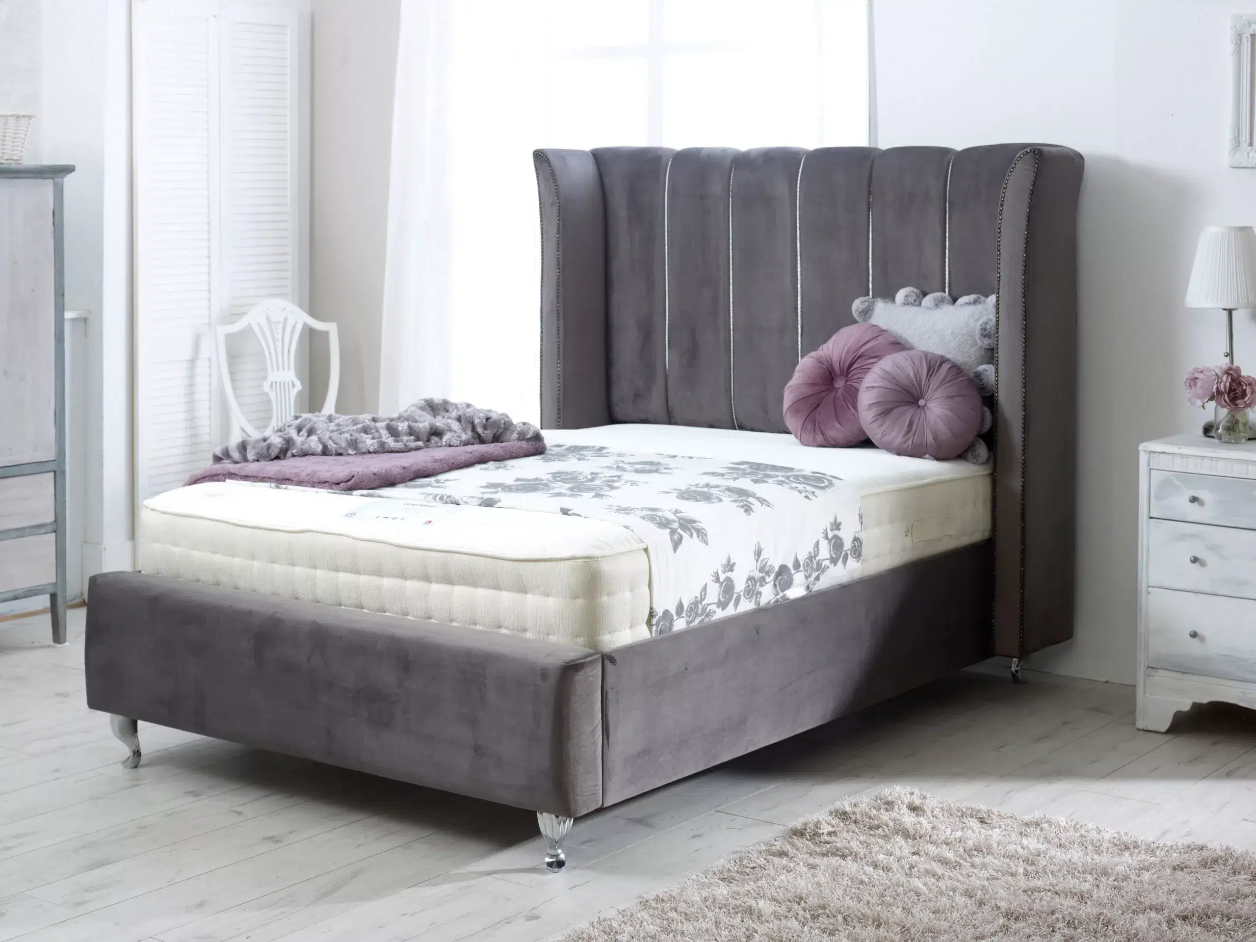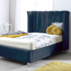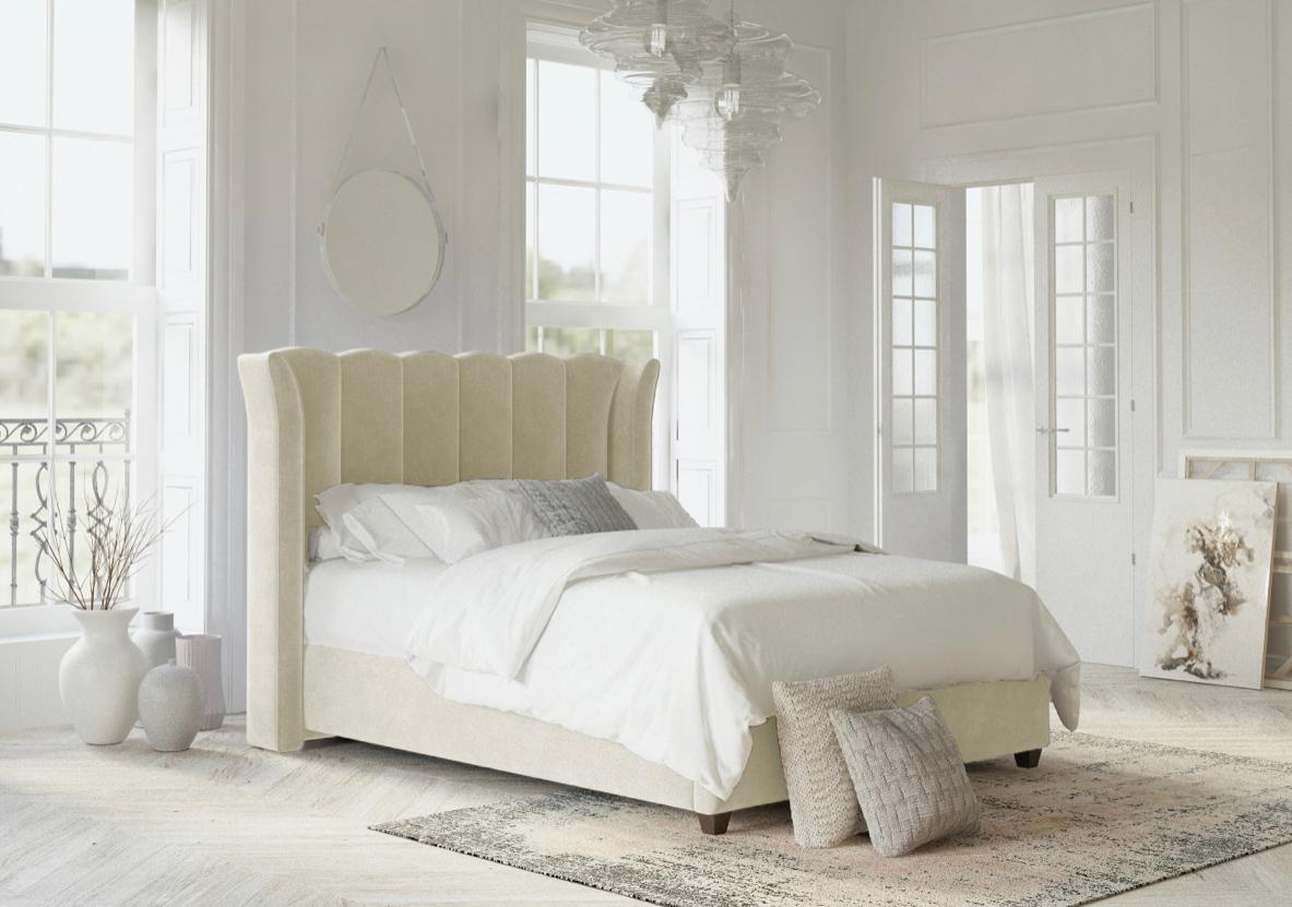 This bed features an imposing curved wing headboard with contrast piping and metal beading. The Chunky upholstered panels make this a very comfortable bed with a luxury feel.